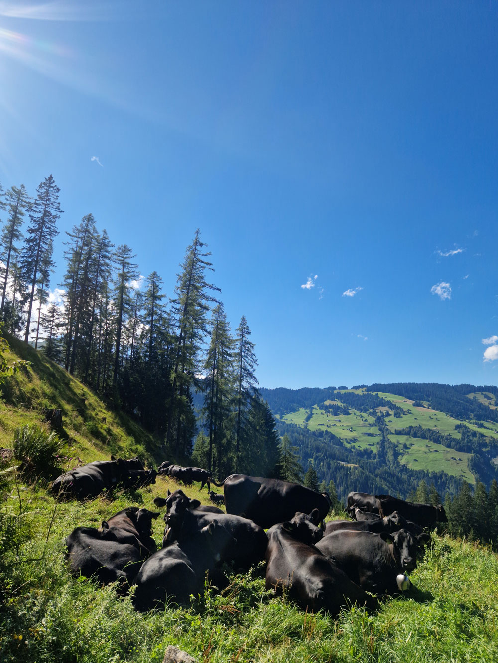 Unsere Angusherde ist im Sommer oberhalb von Jenaz auf der Sommerweide, im Winter leben sie im Freilaufstall mit Auslauf und werden ausschliesslich mit unserem betriebseigenen Bio-Futter (Heu, Emd und Grassilage) versorgt.