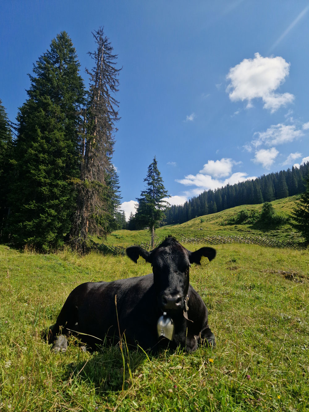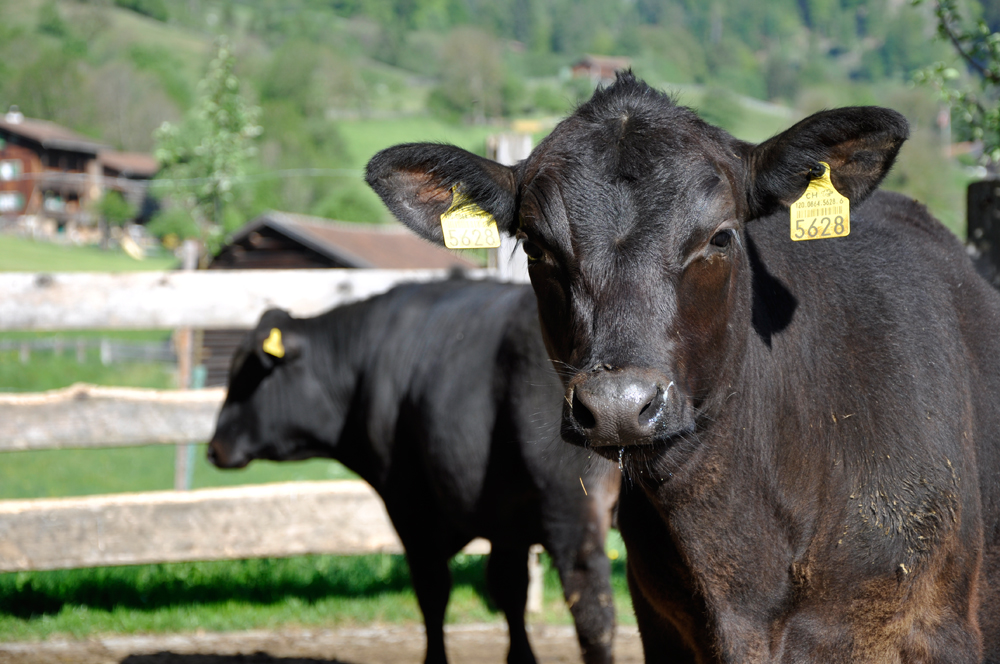Die Angusrasse stammt ursprünglich aus Schottland. Die Tiere sind genetisch hornlos und tragen meist ein einfarbig schwarzes Fell, welches ihnen ein Erscheinungsbild der besonderen Eleganz verleiht. Die Angus-Kühe sind von Natur aus äusserst robust und anpassungsfähig. Dank ihrem ausgeprägten Mutterinstinkt behüten sie ihren Nachwuchs aufs Beste, das uns zugutekommt, da der Druck der Grossraubtiere immer präsenter wird. Unsere Mutterkühe bekommen einmal jährlich ein Kalb. Dieses bleibt von Geburt an bei seiner Mutter, vorwiegend trinkt es deren Milch wann immer es will, später wird es auch Heu und Gras fressen und kann sich in unserer Herde frei bewegen.